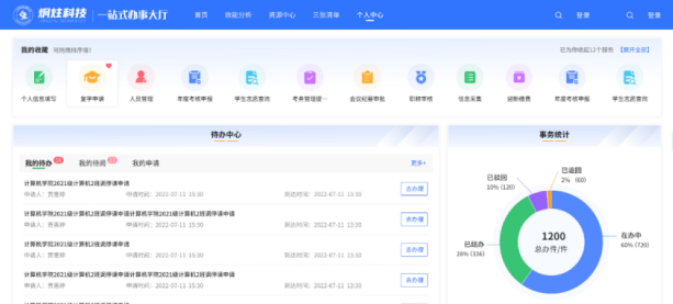 以個人信息為中心,展示個人手冊的服務(wù)、辦理的數(shù)據(jù)(我的待辦、我的待閱、我的申請、我的已辦等)。